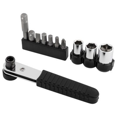 Set includes: 8, 10, and 12mm six-point sockets, a socket extension, a #2 Phillips and #2 slotted head screwdriver, and 4, 5, and 6mm Allen bits.